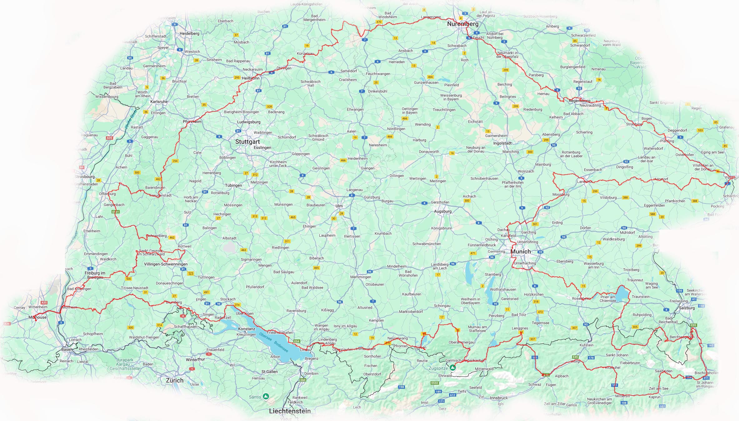 Départ et retour au camping de l'Ill à Mulhouse pour une virée de 2300km en Bavière et ce, pour une quinzaine de jours.